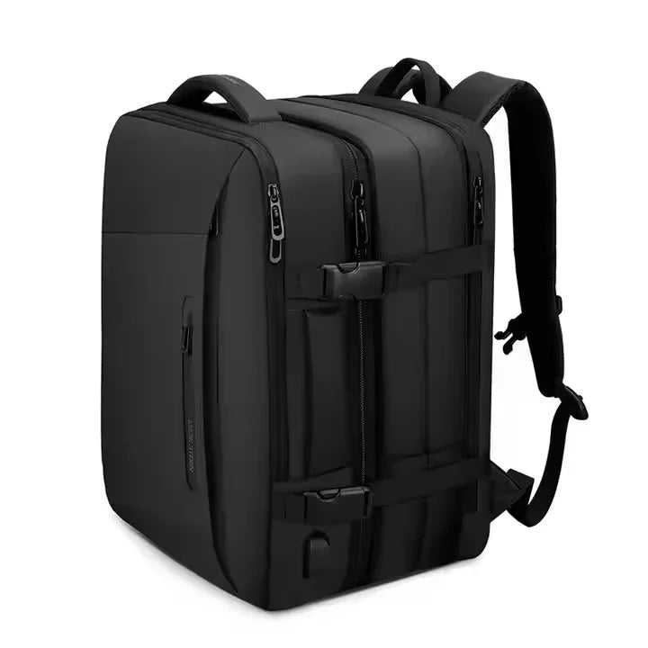 Le sac propose trois zones distinctes : un compartiment principal pour les vêtements avec sangles de maintien, un panneau d’organisation avec poches filet/zippées et une poche numérique séparée. L’espace dédié aux appareils accueille un ordinateur jusqu’à 17" et une tablette 11". Une extension fait passer la profondeur de 16 à 26 cm pour gagner du volume lorsque c’est utile. Le port USB pass-through permet de brancher une batterie externe. Le portage s’effectue par des bretelles réglables avec sangle pectorale, complété par des poignées supérieure et latérale. Des sangles de compression latérales aident à stabiliser le contenu