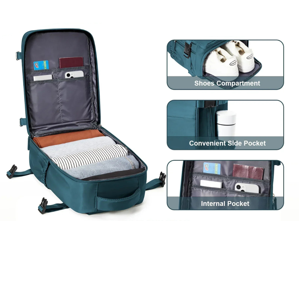 Grâce à son système d’extension zippée, le sac augmente sa capacité jusqu’à 30 % tout en restant dans les limites imposées. Son agencement intérieur t’aide à séparer chaussures, vêtements ou objets essentiels, et ses poches supplémentaires facilitent l’accès rapide à ce dont tu as besoin pendant le trajet.