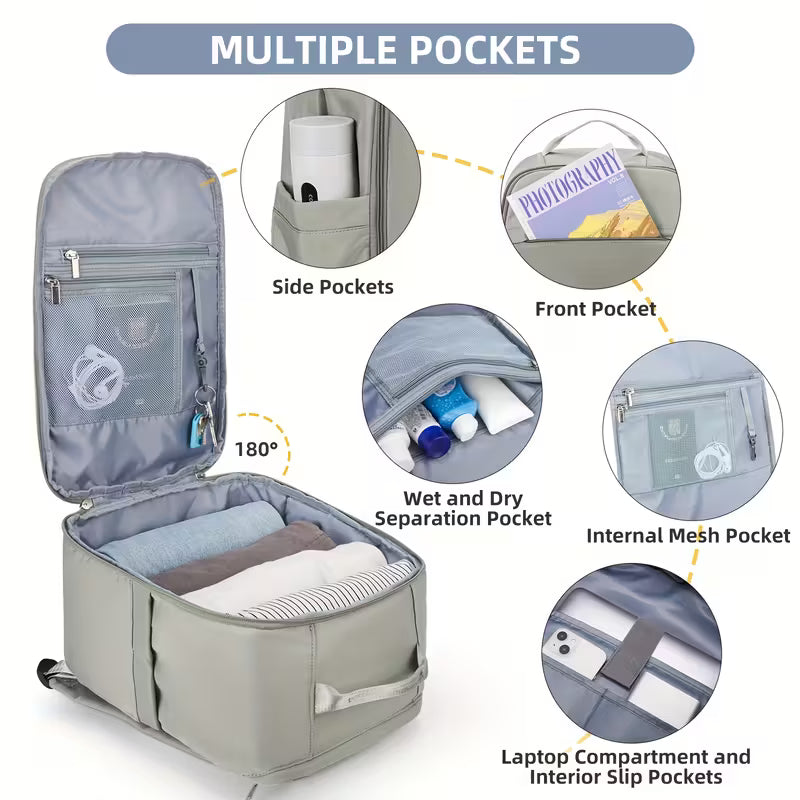 Voyager léger, sans compromis. Avec plusieurs compartiments, ses sangles de maintien et ses bretelles ergonomiques, tout reste organisé et confortable. Le sac respecte les limites de poids cabine (6–12 kg) pour éviter tout frais surprise. Et grâce au compartiment PC latéral et aux poches passeport, vous passez les contrôles en un instant, sans stress ni perte de temps.