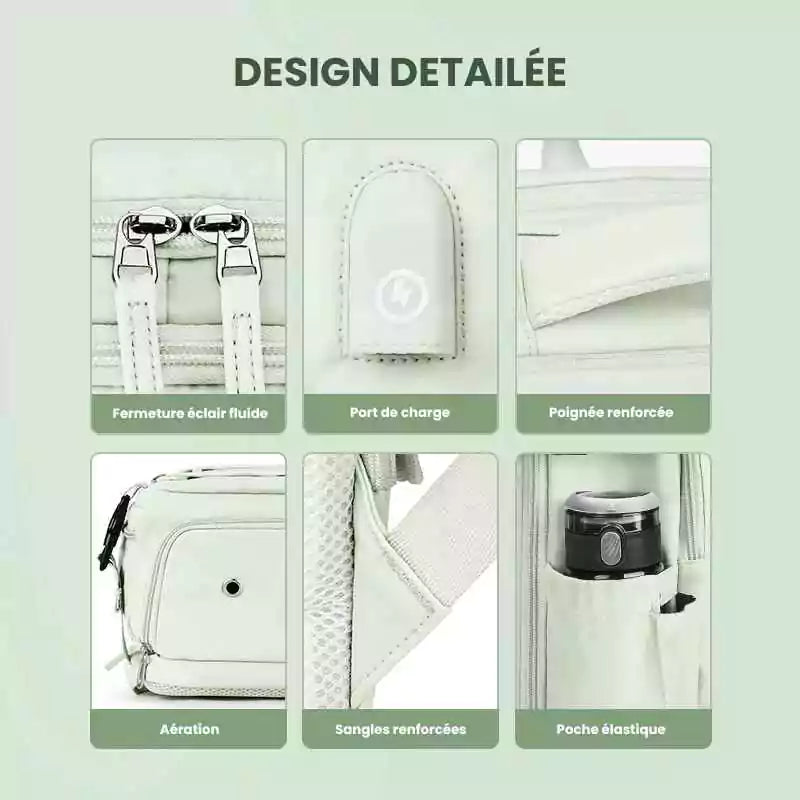 Multiples compartiments fonctionnels permettant de voyager propre et organisé.