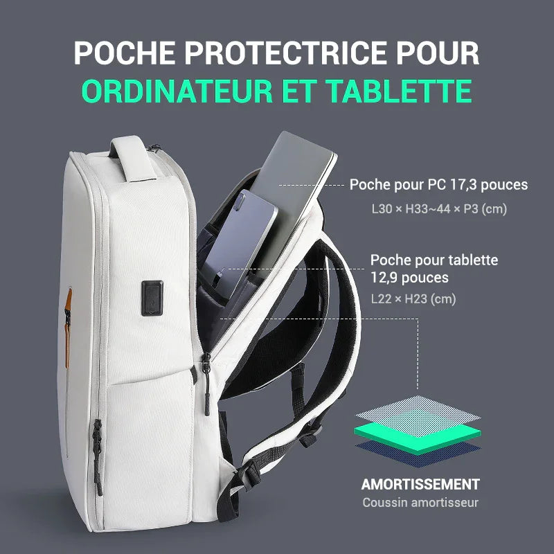 Le sac présenté est conçu pour les trajets courts et les allers-retours quotidiens. L’intérieur montre un compartiment principal avec sangles croisées de maintien, des poches filet zippées sur le rabat et deux pochettes extensibles. Un espace dédié accueille un ordinateur jusqu’à 17,3" et une tablette 12,9". Le port USB pass-through est accessible sur le côté (batterie externe non incluse).