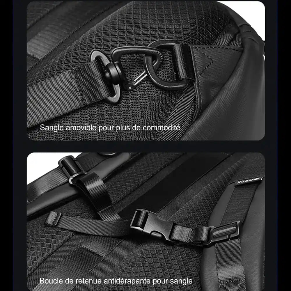 Le sac dispose d’une sangle amovible et de boucles de retenue qui empêchent le glissement, offrant plus de stabilité lors du transport.