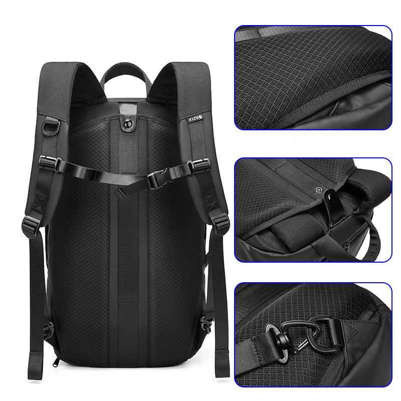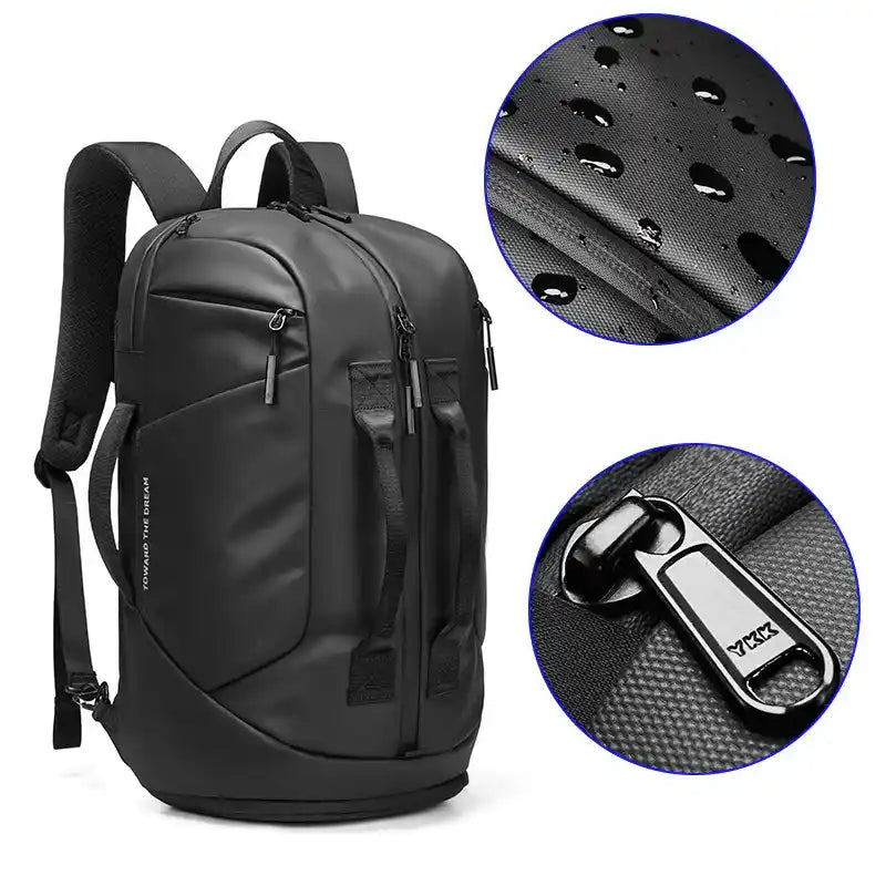 Le sac permet de voyager sans enregistrer de bagage, tout en gardant ses affaires organisées. Son format est adapté aux dimensions cabine imposées par la plupart des compagnies. L’intérieur comprend un compartiment principal, une poche PC jusqu’à 15,6 pouces, ainsi qu’un espace séparé pour les chaussures ou vêtements usés. La surface extérieure est traitée pour résister à l’humidité.